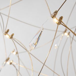 Una obra de arte cobra vida en esta colección. Conformada por brazos de aluminio en acabado oro, esta colección se terminan en brillantes destellos de luz LED acompañados de acrílico que la convierten totalmente en la pièce de résistance.